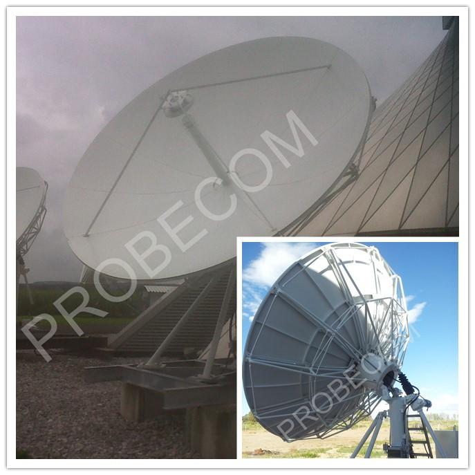 The probecom 4.5-meter antenna delivers exceptional performance for transmit/receive and receive only applications for L through Ka-band frequencies. This antenna offers a reflector design that incorporates precision-formed panels, truss radials and hub assembly using matched tooling for interchangeable components. It features an innovative Cassegrain or Ring Focus feed and sub-reflector design which results in high gain, low noise temperature, high antenna efficiency and excellent rejection of noise and microwave interference. A large center hub provides spacious accommodation for equipment mounting. The reflector is supported by a galvanized elevation over azimuth kingpost pedestal that provides the required stiffness for pointing and tracking accuracy. The pedestals are designed for full orbital arc coverage and are readily adaptable to ground or rooftop installations.