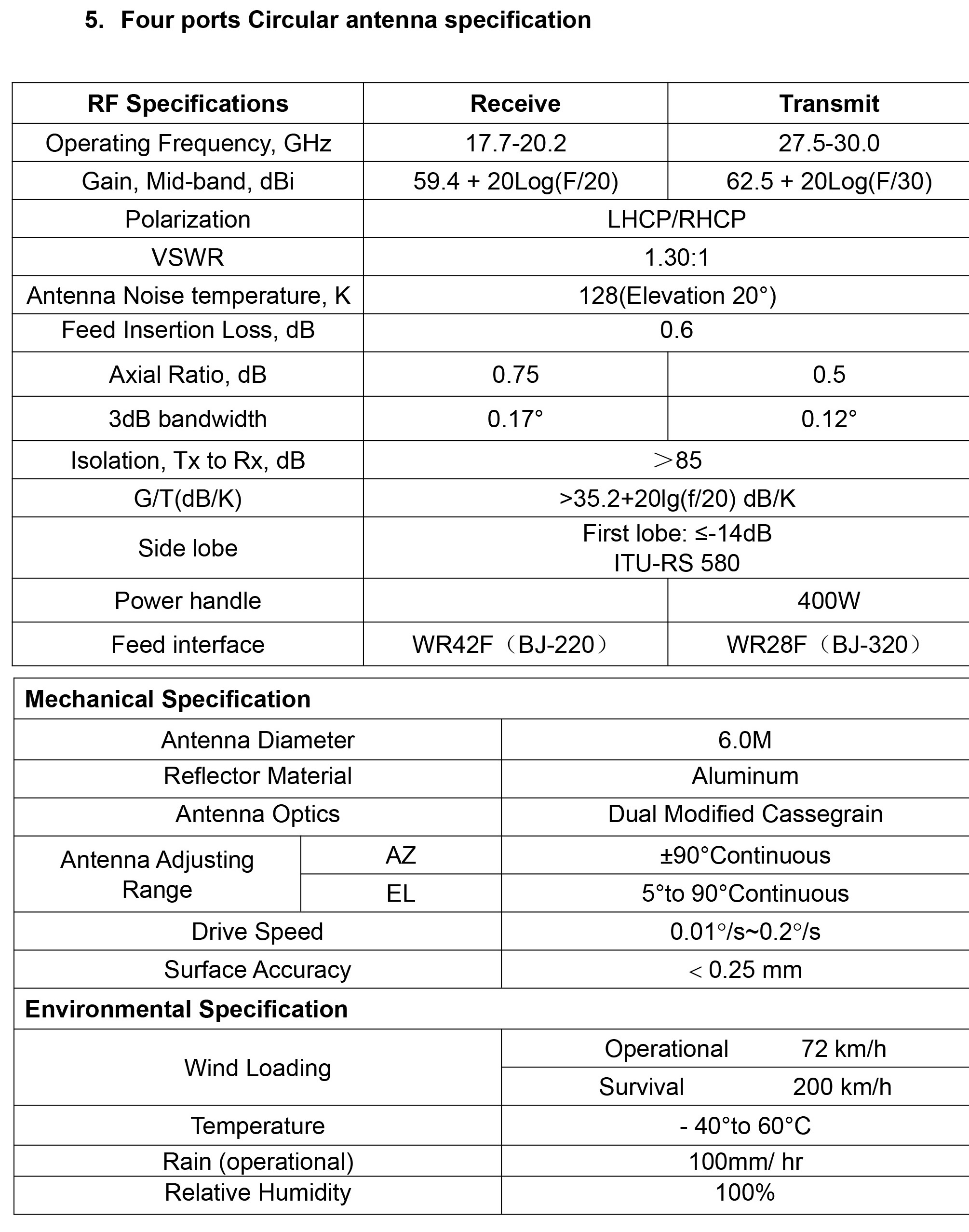 Probecom 6.0M Ka band antenna adopts all aluminum re-enforced reflectors, consisting of precisely formed panels with matched radials and hub assemblies, ensure the ease of installation. The standard designed azimuth over elevation pedestal provides a cost-effective solution for high stiffness and stability, full orbital arc coverage and fine drive performance, and ensures the pointing accuracy for Ka-Band.