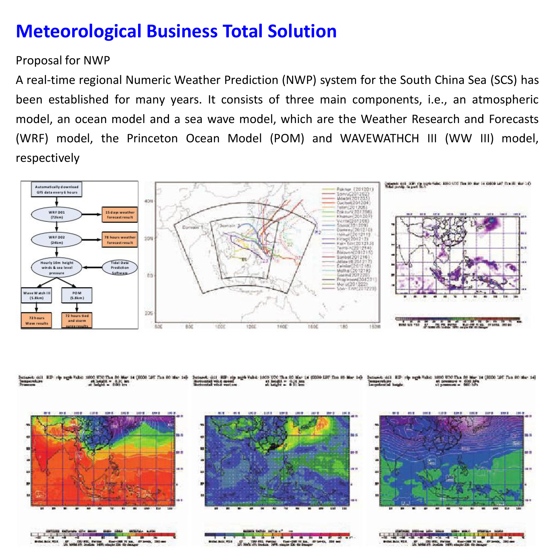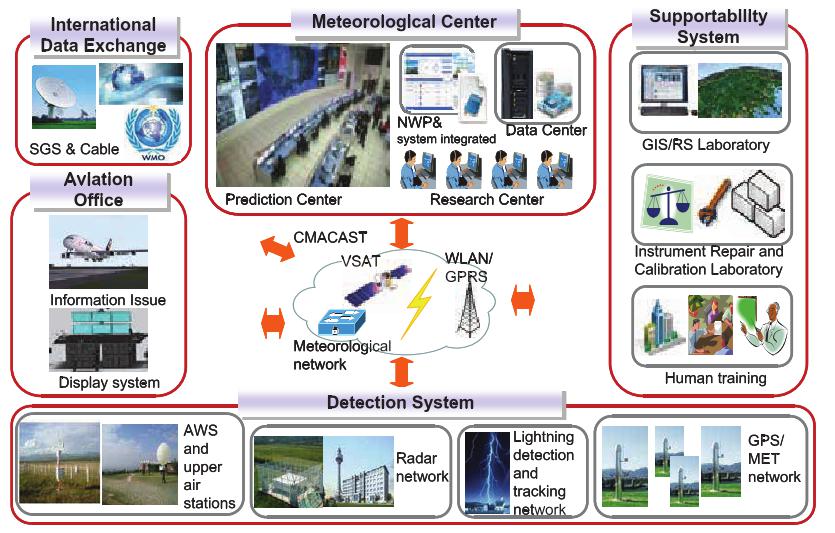 meteorological satellite receiver. Alert prediction system adopt numerical simulation to provide numerical weather prediction, including short-time, short-term and middle-term weather prediction. Meteorological maintaining system is to secure the normal operation of meteorological observation system, covering the maintenance of observation instruments and information system, and the secure of man-power resource. Meteorological information service system is a comprehensive platform for exchanging, storing, releasing and visualizing display meteorological information, and managing the communication, storage and share of meteorological information