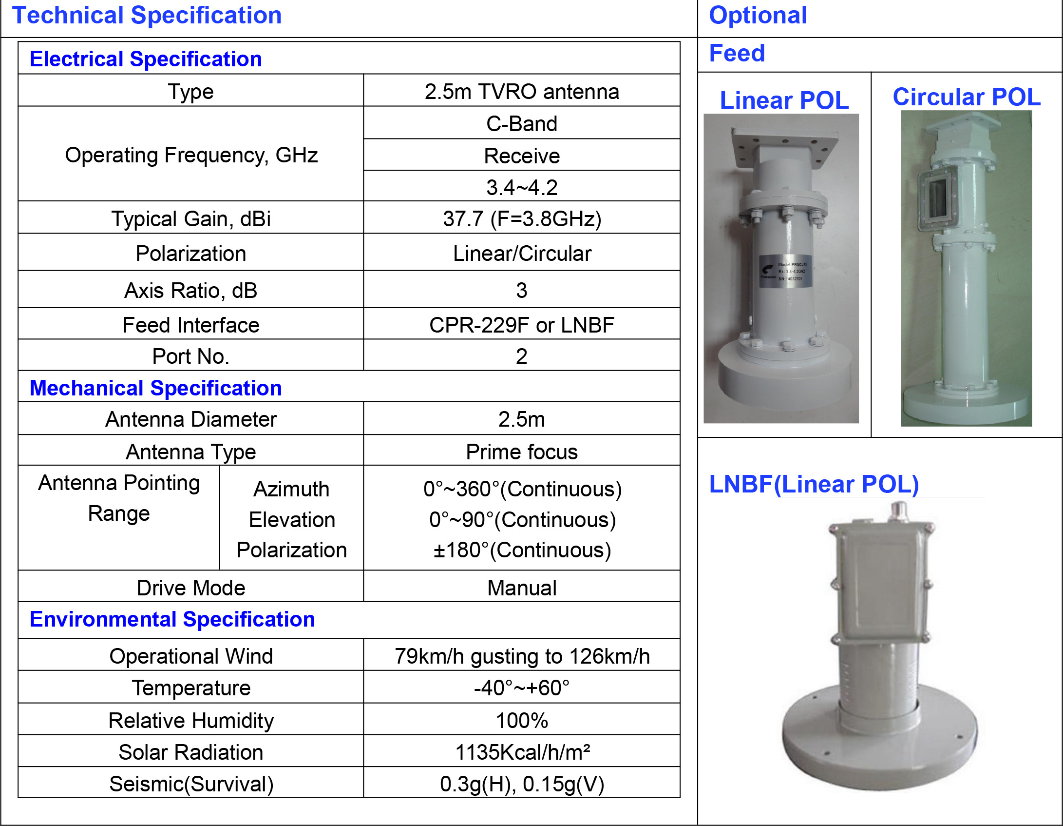 Probecom can supply 2.5m Satellite receive only antenna meet data receive and TV requirement. Probecom TVRO (TV receive only antenna) antenna is made of high accuracy stretch-formed aluminum panel with stable structure. The TVRO antenna systems with satisfactory performance of high gain, low side lobe and reliable operation, easy to operate and maintenance.