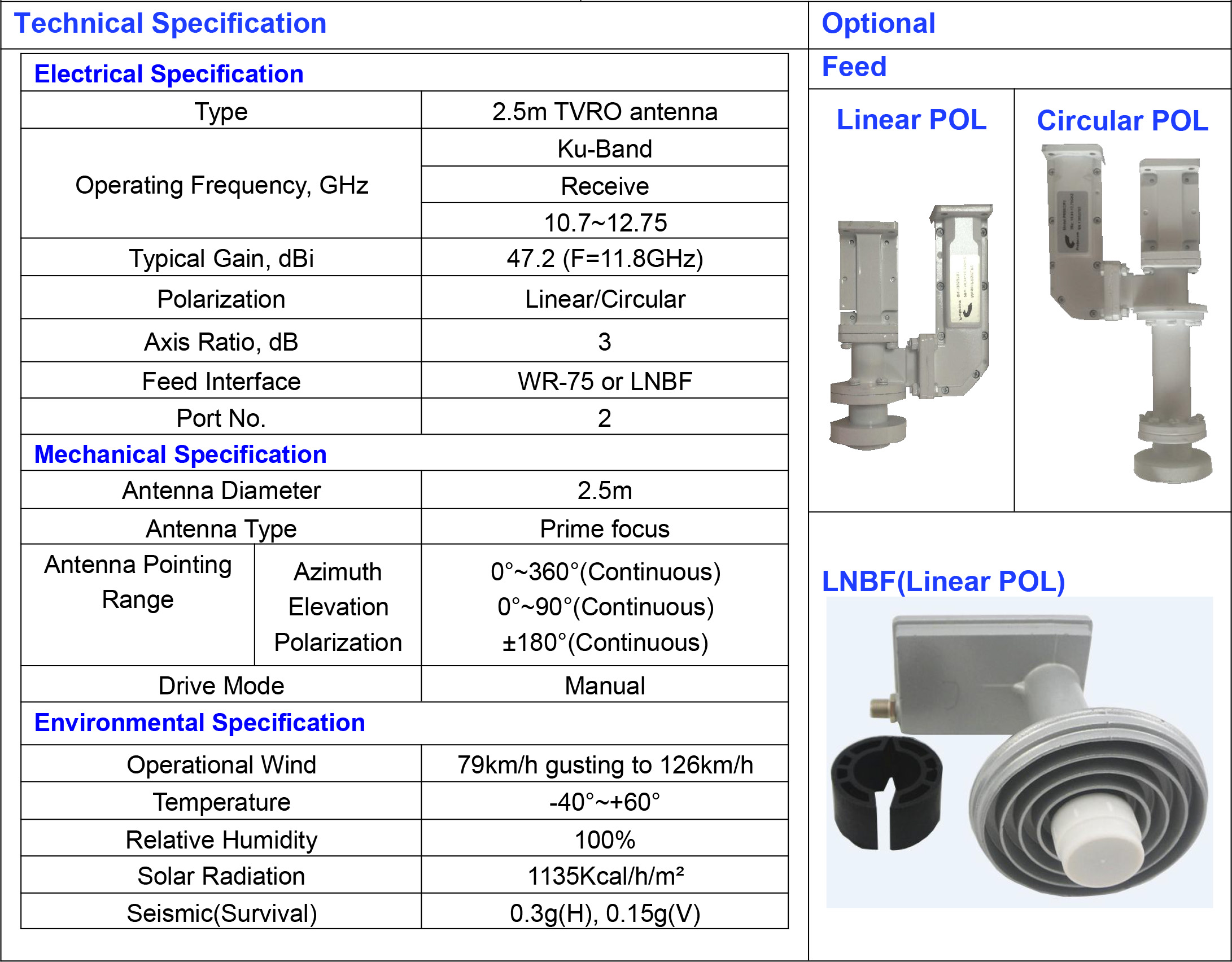 Probecom can supply 2.5m Ku band Satellite receive only antenna meet data receive and TV requirement. Probecom TVRO antenna is made of high accuracy stretch-formed aluminum panel with stable structure. The TVRO antenna systems with satisfactory performance of high gain, low side lobe and reliable operation, easy to operate and maintenance.