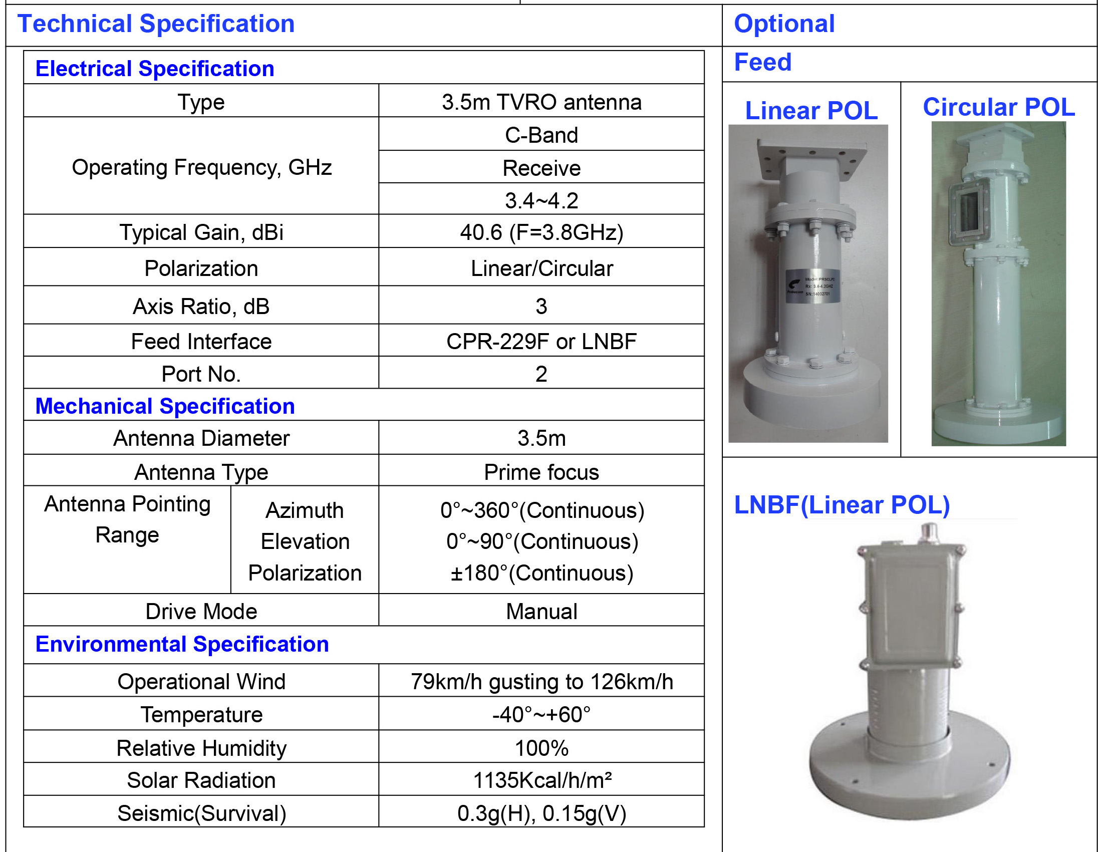 Probecom can supply 3.5m C band Satellite receive only antenna meet data receive and TV requirement. Probecom TVRO antenna is made of high accuracy stretch-formed aluminum panel with stable structure. The TVRO antenna systems with satisfactory performance of high gain, low side lobe and reliable operation, easy to operate and maintenance.