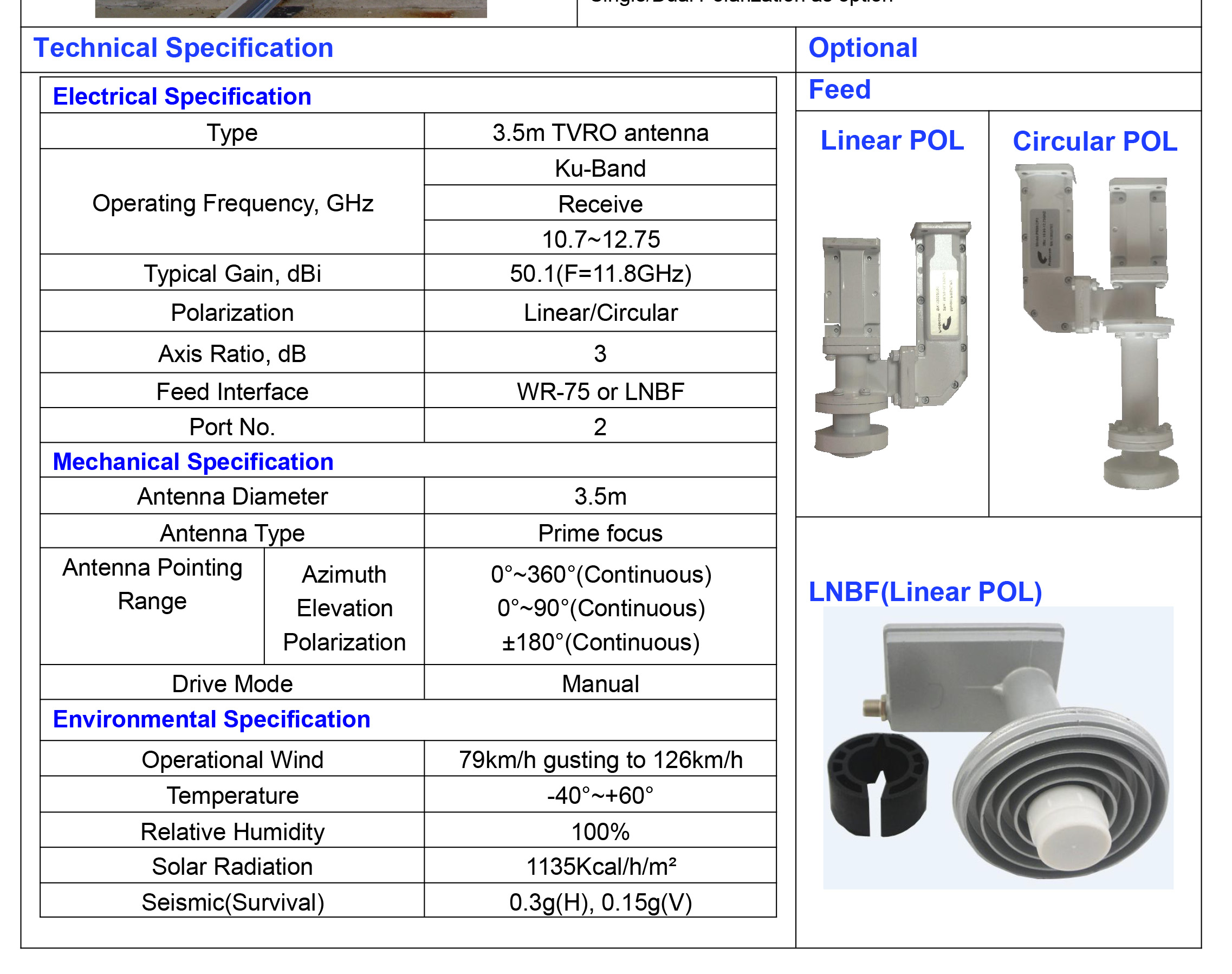 Probecom can supply 3.5m Ku band Satellite receive only antenna meet data receive and TV requirement. Probecom TVRO antenna is made of high accuracy stretch-formed aluminum panel with stable structure. The TVRO antenna systems with satisfactory performance of high gain, low side lobe and reliable operation, easy to operate and maintenance.