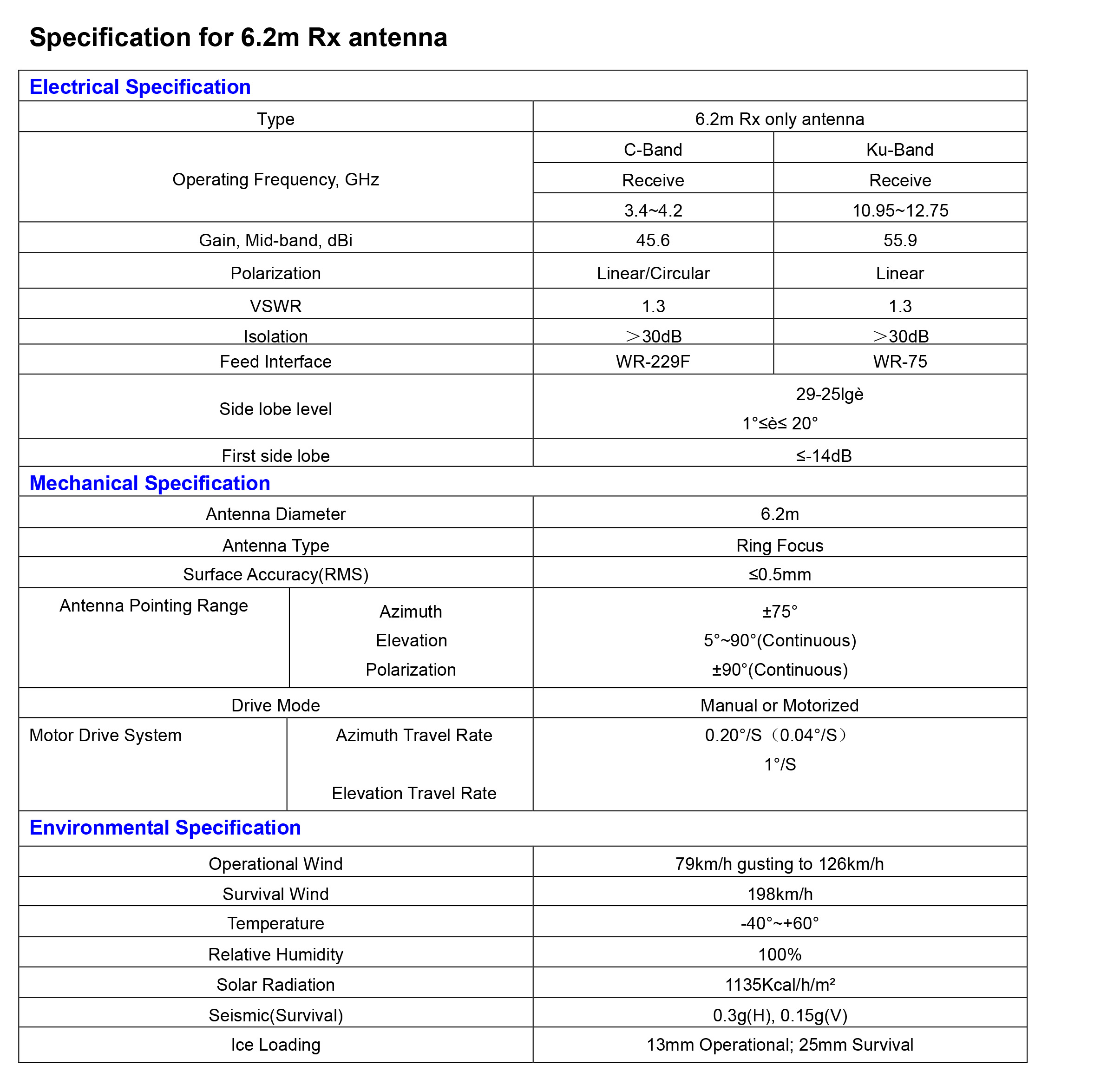 Probecom can supply 6.2m Satellite receive only antenna meet data receive and TV requirement. Probecom RXO antenna is made of high accuracy stretch-formed aluminum panel with stable structure. The RXO antenna systems with satisfactory performance of high gain, low side lobe and reliable operation, easy to operate and maintenance.